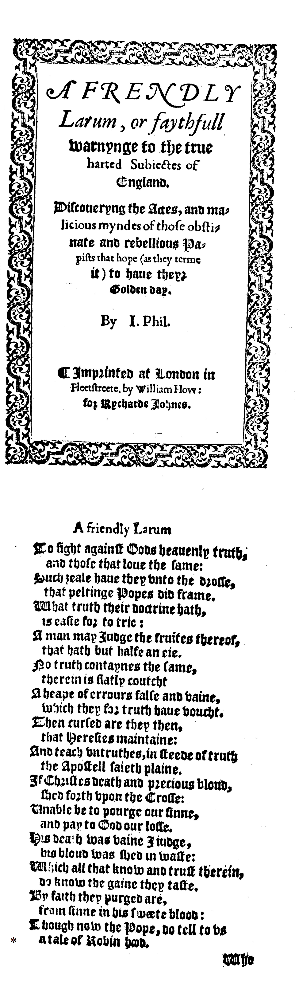 A frendly larum, or faythfull warnynge to the true harted subiectes of England