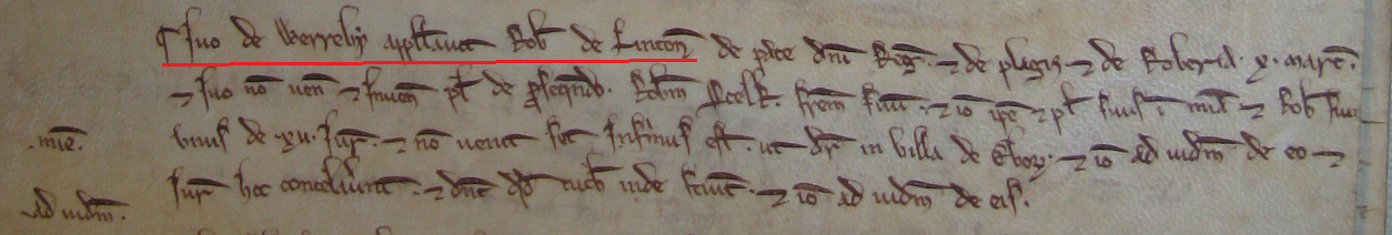 Robertus filius predicti Ivonis appellauit Willelmum le Paulmer pro accessorio et similiter de facto, non uenit et inuenit fidejussores pro prosecutione. Yvo pater ejus et Robertus Scelk, qui sunt inde in misericordia . Juratores nichil sciunt sed testantur quod hoc factum fuit pro malitia.