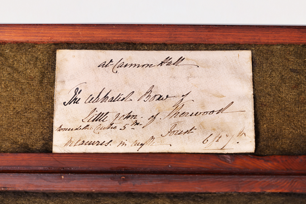 The note accompanying the case: ‘at Cannon Hall – The celebrated Bow of Little John of Sherwood …. measures …. 6ft 7in.’