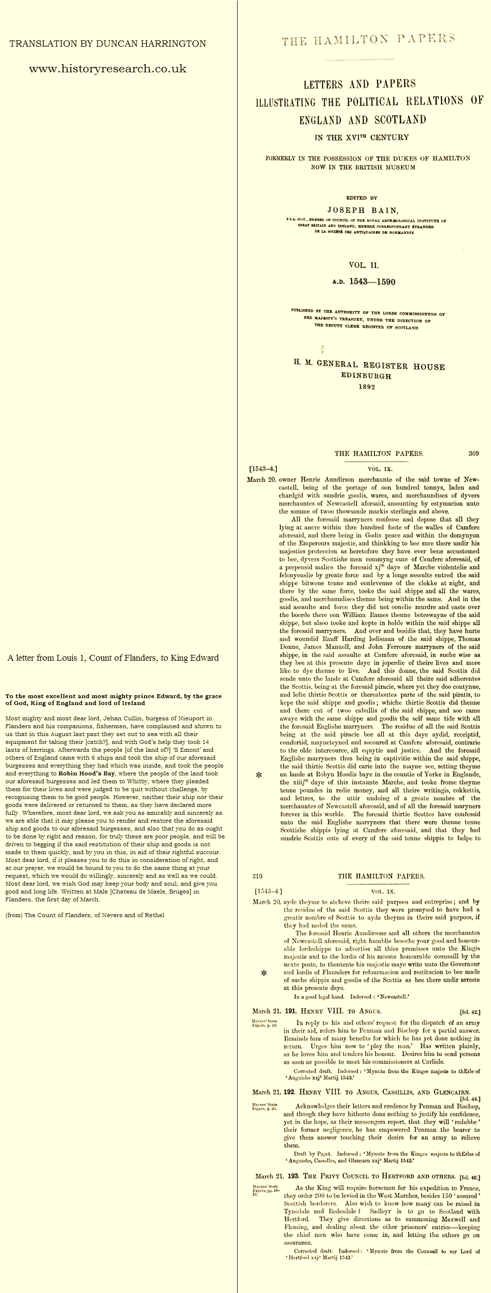 There is another translation of the letter by Ian Short, Emeritus Professor of French at Birkbeck, University of London, and another by David Crook (with the help of Michael Jones and Stephen O’ Connor) in Robin Hood: Legend and Reality, 2020, pp. 158-9. The record in the Hamilton Papers also appears in Letters and Papers, Foreign and Domestic, of the Reign of Henry VIII, Vol. XIX-Part 1, James Gairdner and R. H. Brodie, London, 1903, p. 122.