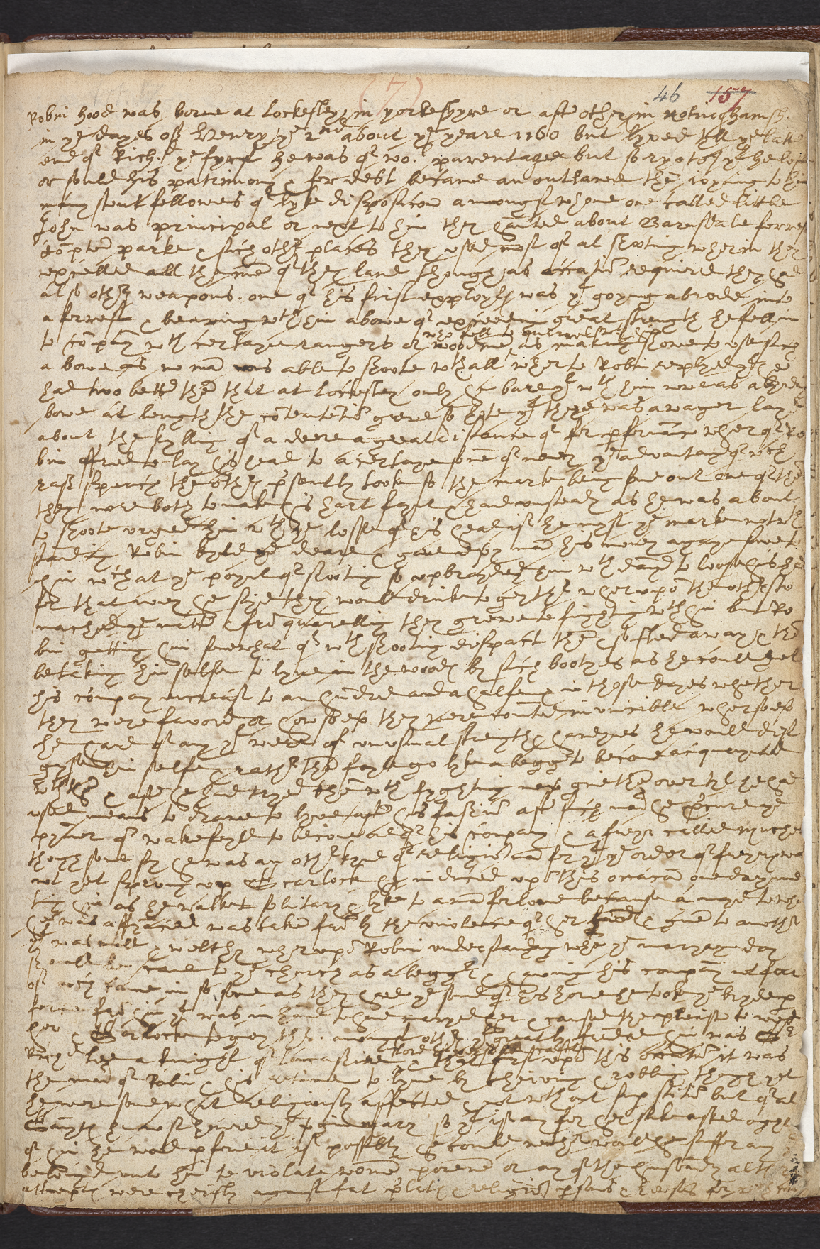 The Sloane Manuscript ‘Life’ consists of five and a half pages of the volume; it is difficult to read, but it was printed somewhat inaccurately by two Victorian editors: William J. Thoms (A Collection of Early Prose Romances), and John Mathew Gutch (A Lytell Geste of Robin Hode). The ‘Life’ gives us the first identification of Robin Hood’s birth-place as the mysterious ‘Lockesley’, which could derive from a now lost ballad. The ‘Life’ was brought to the attention of the public by Joseph Ritson, who used it in the course of his famous introduction ‘The Life of Robin Hood,’ in the first edition of Robin Hood: A Collection of all the Ancient Poems, Songs and Ballads, now extant, relative to that celebrated English Outlaw (2 vols., London) published in 1795. It is widely accepted that the ‘Life’ was composed towards the end of the sixteenth century, possibly before the contributions made to the Robin Hood legend by Anthony Munday. The text could be a copy of an original that was read aloud to a scribe; proper names such as Plumpton appear to be written as Clopton or Clomptoun. Also certain phrases, first left out, were later written in above the line.