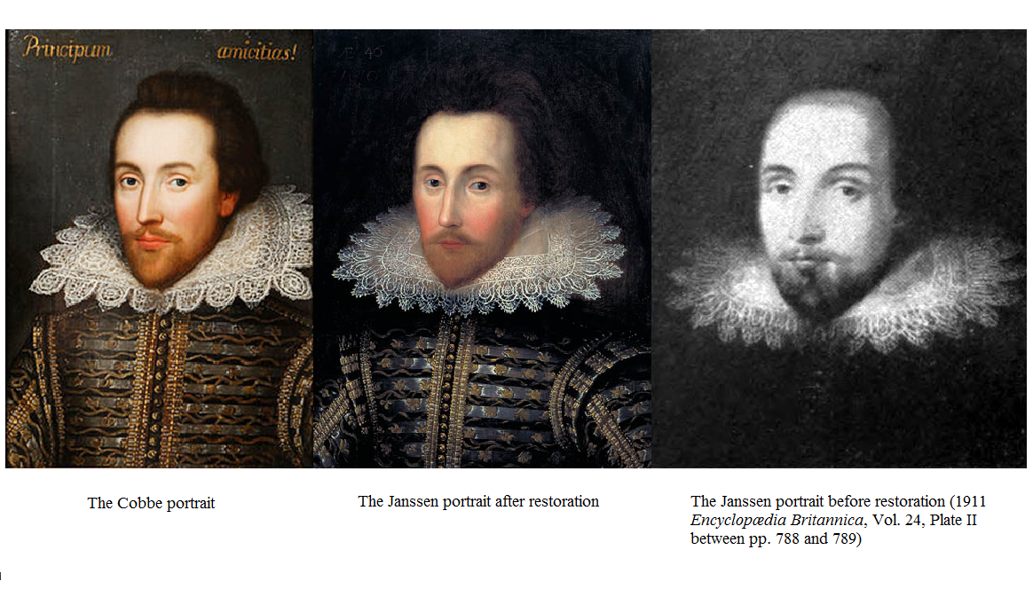 See, Dictionary of National Biography, 1885-1900, Vol. 51, Shakespeare, William by Sidney Lee, pp. 348-97; Encyclopedia Britannica, 1911, Vol. 24, Shakespeare, William: The Portraits of Shakespeare, Marion Harry Alexander Spielmann; News-Letter, The Shakespeare Fellowship, American Branch, Vol 1, February, 1940, No 2, ‘The Secret Personality of ‘Shakespeare’ Brought to Light After Three Centuries.’; A Dictionary of Shakespeare, Stanley Wells, Oxford University Press, 1998, ‘Grafton’ portrait of Shakespeare.’; The Guardian, Charlotte Higgins, 2006, ‘The only true painting of Shakespeare – probably.’; CNN, 2009, ‘Unique portrait from Shakespeare’s life unveiled, 2009.’; The Guardian, Mark Brown, 2009, ‘A new view: is this the real Shakespeare?’; The Guardian, Charlotte Higgins, 2009, ‘To find the mind’s construction in the face: The great Shakespeare debate.’; BBC News Magazine, 2009, ‘Why is this the definitive image of Shakespeare?’; Time Magazine, Richard Lacayo, 2009, ‘Is This What Shakespeare Looked Like?’; Shakespeare Online, Alexander Cargill, 2009, ‘Physiognomy and Portraits of Shakespeare.’; News.com.au, Richard Brooks, 2009, ‘Is this portrait the real Shakespeare at last?’; Blogging Shakespeare, Embracing Shakespearean Conversation in a Digital Age (Shakespeare Birthplace Trust), Stanley Wells, 2010, ‘Shakespeare Death Mask.’; Shakespeare Birthplace Trust, Catherine Simpson, 2012, ‘The Flower Portrait of Shakespeare.’; Politicworm, Shakespeare authorship, 2013, ‘To Be or Not to Be Shakespeare: What the portraits tell us.’; The Victorian Web, Mike Hickox, 2014, ‘Shakespeare, Phrenology, and Henry Wallis’s A Sculptor’s Workshop.’; The Shakespeare blog, Sylvia Morris, 2015, ‘Henry Wallis: a pre-Raphaelite’s views of Shakespeare’s Stratford.’; The Cobbe Collection Trust, 2016, ‘Alec Cobbe – The Cobbe Portrait of Shakespeare.’; Folgerpedia, 2016, ‘The Ashbourne portrait.’; Bath, Art and Architecture, David Bridgwater, 2016, ‘The Roubiliac Statue of William Shakespeare for David Garrick.’; Oxford Academic, Mike McKiernan, 2018, ‘A Sculptor’s Workshop, Stratford-upon-Avon 1617 (replica by Henry Wallis), 1857.’; Folgerpedia, 2019, ‘Art in the reading rooms.’; Canadian Adaptations of Shakespeare Project, Daniel Fischlin, 2020, ‘The Sanders Portrait.’; Westminster Abbey, Dean and Chapter of Westminster, 2020, ‘William Shakespeare Playwright.’; National Portrait Gallery, London.; Art UK, ‘The Cobbe Portrait of William Shakespeare (1564-1616)’; LUNA: Folger Digital Image Collection, ‘Janssen Portrait of Shakespeare.’; Politicworm, Shakespeare authorship, ‘Visualizing Shakespeare: A Tale of Two Portraits.’; National Portrait Gallery, ‘Richard Earlom, (1743-1822), Engraver.’; LUNA: Folger Digital Image Collection, ‘Portrait of an unknown man (the Zuccaro Shakespeare).’; Hildegard Hammerschmidt-Hummel, ‘Authentic Images of Shakespeare.’; PabloPicasso.org, Pablo Picasso, Paintings, Quotes, & Biography, ‘WilliamShakespeare Portrait, 1964 by Picasso.’; COTSWOLDS.INFO, ‘Sculptures in Stratford upon Avon.’