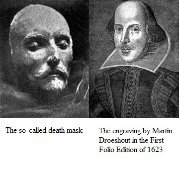 The monument bust is believed to have been commissioned by Shakespeare’s son-in-law, Dr John Hall, and is thought to have been modelled from either a life or death mask. There are many so-called ‘casts’ of the busts. George Bullock took a cast in 1814 and Signer A. Michele another about forty years after. The ‘Kesselstadt Death Mask,’ was claimed to be the death-mask of Shakespeare, and it was used to gauge the authenticity of other portraits. It was thought not to be a death-mask at all, but a cast from one and probably not even a direct cast. In three places on the back of it is the inscription +AˆDm1616: and this is the sole actual link with Shakespeare. The mask first came to light in 1849, having been searched for by Dr. Ludwig Becker, the owner of a miniature in oil or parchment representing a corpse crowned with a wreath, lying in bed, while on the background, next to a burning candle, is the date — Ao 1637. This little picture was by tradition asserted to be Shakespeare, although the likeness, the death-date, and the wreath all point unmistakably to the poet-laureate Ben Jonson. Dr Becker had purchased the mask at the death-sale at Mainz of Count Kesselstadt in 1847, in which also ‘a plaster of Paris cast’ (with no suggestion of Shakespeare then attached to it) had appeared. This he found in a broker’s rag-shop, assumed it to be the same, recognized in it a resemblance to the picture (which most persons cannot see) and therefore attached enormous historical value to it. A search for the link of evidence necessary to be established, through the Kesselstadt line to England and Shakespeare, has never been proved or carried beyond the point of conjecture. There are strong arguments against the authenticity of the mask, most notable is the differences between it and the Droeshout print of Shakespeare’s head in the frontispiece of the first folio. The mask was on view in the British Museum, where it was carefully studied by Professor Richard Owen. He was convinced that it was the model used by Gerard Johnson when he created the Shakespeare bust for the funerary monument in Holy Trinity Church at Stratford. Among the many adherents of the theory was William Page, the American painter, who made many measurements of the mask and found that nearly half of them agreed with those of the Stratford bust; the greater number which do not he conveniently attributed to error in the sculptor. The mask was shown in the Stratford Centenary Exhibition in 1864, and is now in Darmstadt, Germany (See, Images Relating to Shakespeare: The D’Avenant Bust (below).