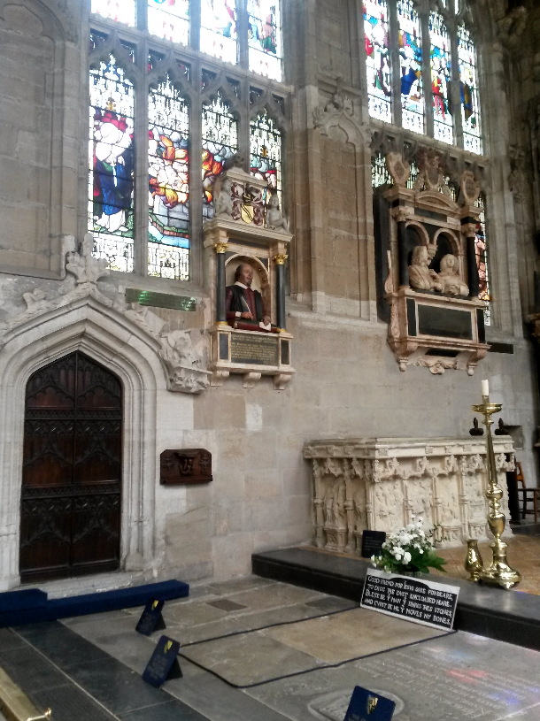 Shakespeare’s monument is placed on the wall to the left of the row of gravestones, and its inscription mentions only his surname. This, along with certain features of its design, has led to the conjecture that it was intended to surmount a tomb on which more facts would have been inscribed, but that this part of the plan was abandoned. In the floor, close to the monument, is the gravestone commemorating Shakespeare’s wife. Although she died seven years after her husband, her stone, not his, lies directly under the monument. Nicholas Rowe, writing in 1709, said that Shakespeare’s gravestone lay ‘underneath’ the monument, which might mean that at that time it lay directly below it, with the result that no identification was necessary.